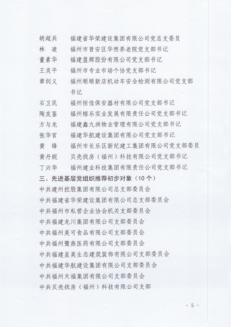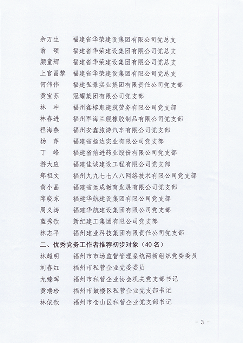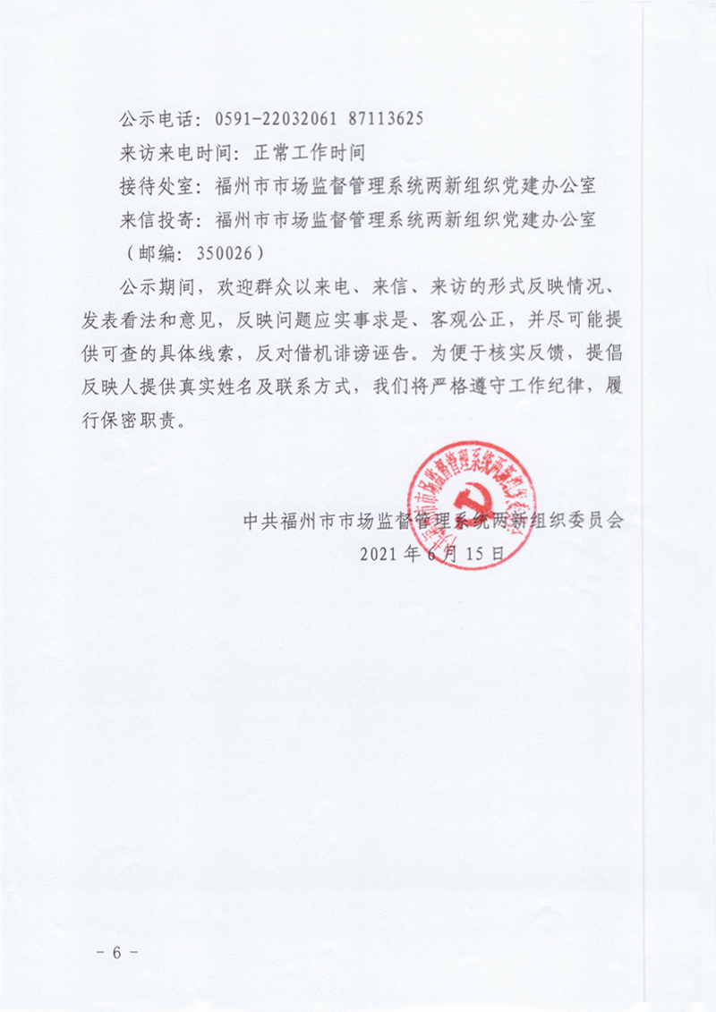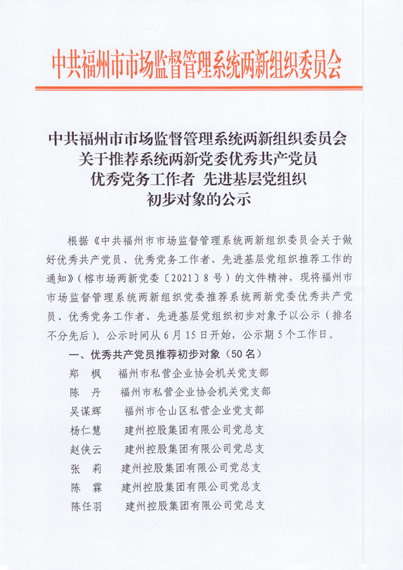 中共福州市市场监督管理系统两新组织委员会关于拟推荐系统两新党委优秀共产党员、优秀党务工作者、先进基层党组织初步对象的公示