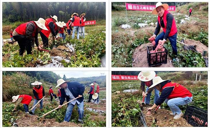 党员们戴上草帽、拿起锄头,在当地村民的指导下,顺藤摸瓜,将一颗颗地瓜从地里挖出,经过一番忙碌,一筐筐地瓜错落排开,大家用劳作和汗水体验着丰收喜悦。