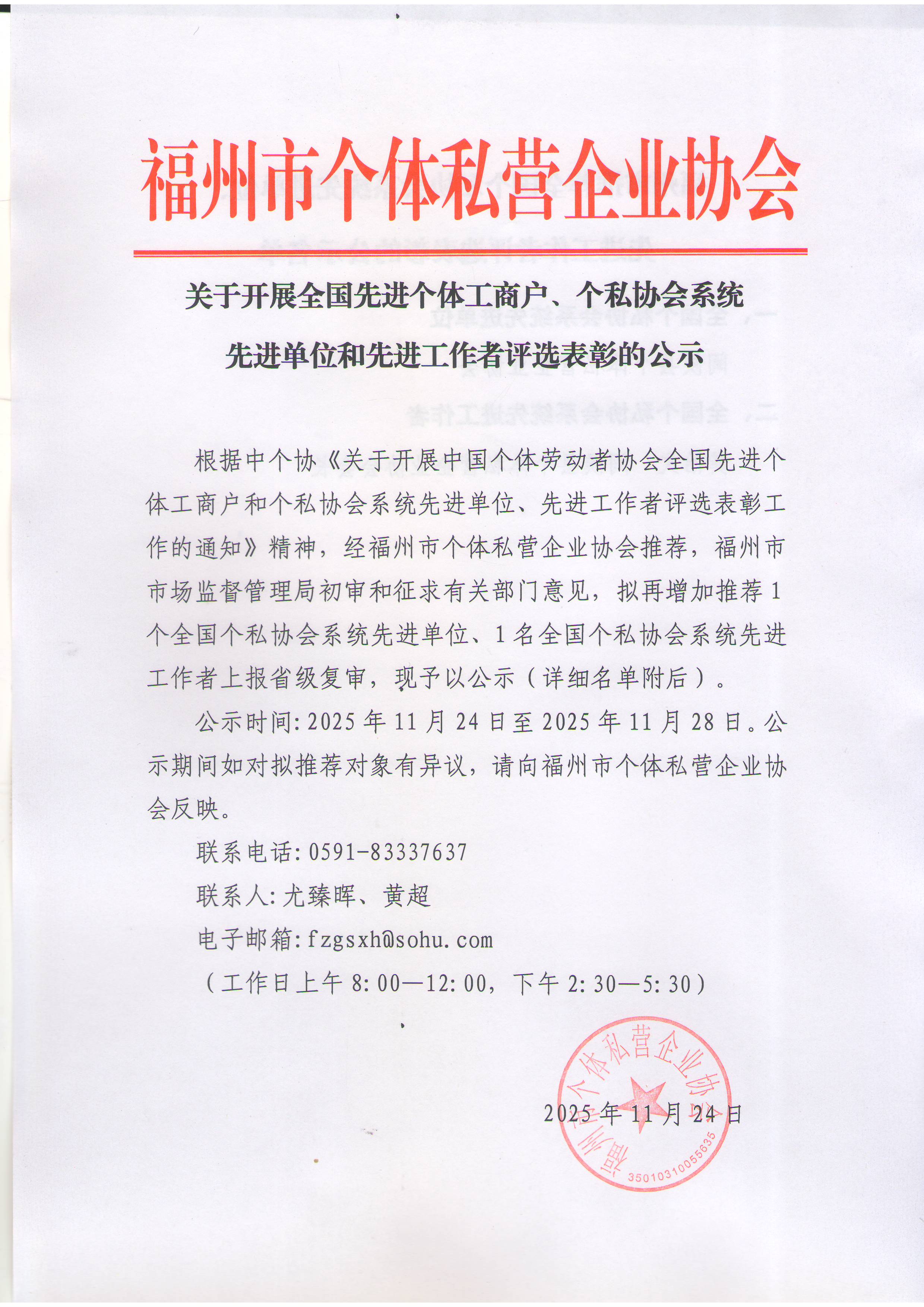 公示时间:2025年11月24日至2025年11月28日、公示期间如对拟推荐对象有异议,请向福州市个体私营企业协会反映。