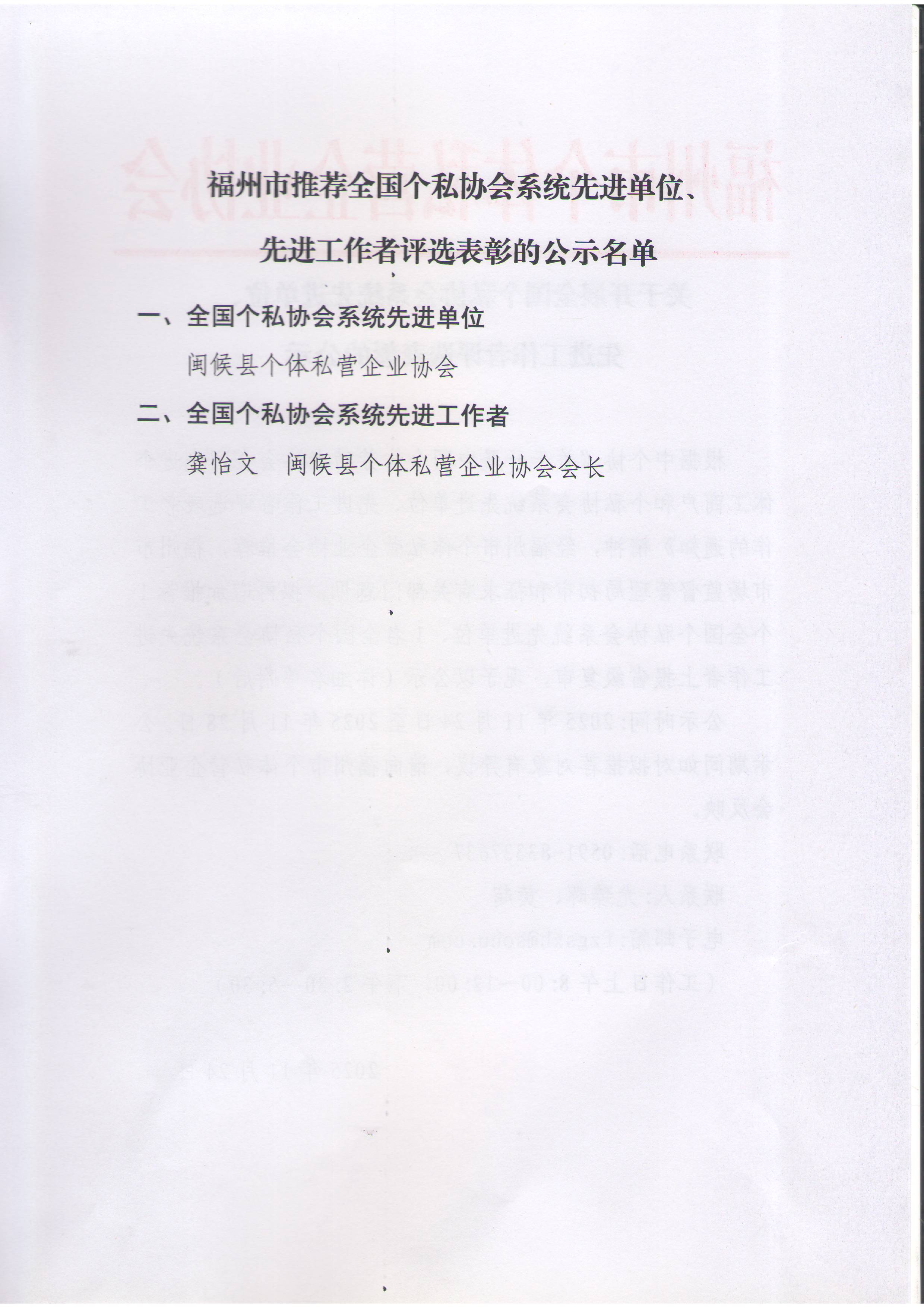 根据中个协《关于开展中国个体劳动者协会全国先进个体工商户和个私协会系统先进单位、先进工作者评选表彰工作的通知》精神,经福州市个体私营企业协会推荐,福州市市场监督管理局初审和征求有关部门意见,拟再增加推荐1个全国个私协会系统先进单位、1名全国个私协会系统先进工作者上报省级复审,现子以公示(详细名单附后)。