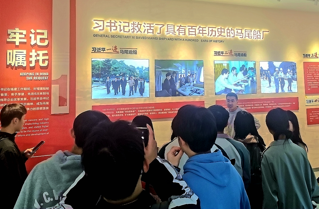 在船厂工作人员的带领下,大家来到造船厂的展览馆。馆内陈列着丰富的历史资料和珍贵文物,生动展示了马尾造船厂从创立至今的发展历程。党员们认真聆听讲解,不时驻足观看,对马尾造船厂在近现代中国船舶工业中的重要地位有了更直观、更深刻的认识。