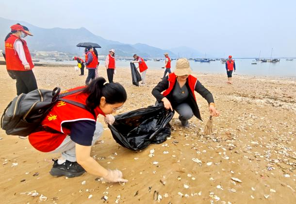 在沙滩上,志愿者们认真捡拾沙滩上的海漂垃圾,无论是塑料瓶、纸张还是其他废弃物,各色“战利品”塞满了垃圾袋,还宁静的海滩一片洁净。